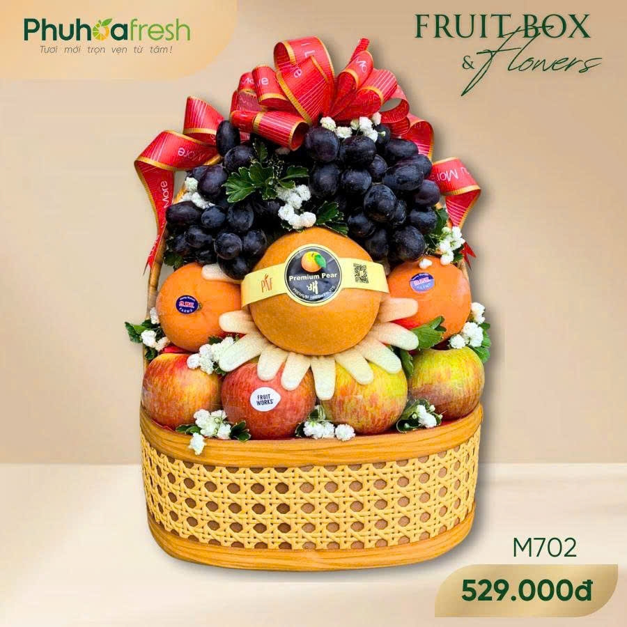 Set quà tặng gồm có: Táo Nam Phi, Nho đen Úc, Lê Trung, Quýt Trung, Giỏ mây và phụ kiện đi kèm