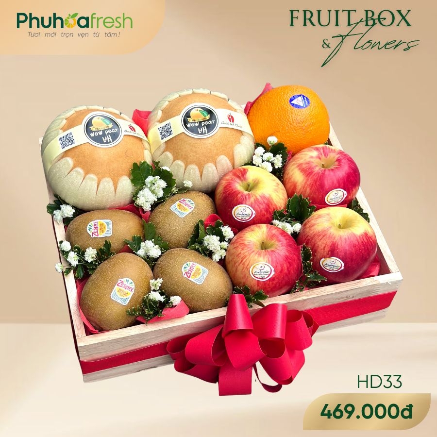 Set quà tặng gồm có: Kiwi vàng New Zealand, Táo Ambrosia New Zealand, Cam ruột vàng Úc, Lê Trung, Hộp gỗ và phụ kiện đi kèm